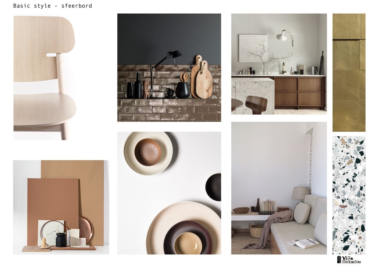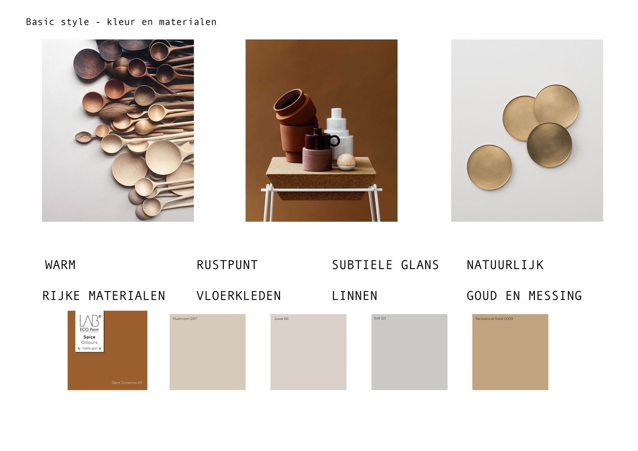 Voor de materialen en de kleuren zie je naast de naturellen en zand en moddertinten ook een aantal warme kleuren. Van Vestingh paint heb ik in het kleur en materialen moodboard de kleur silent cinnemon en sensational sand gebruikt. Deze kleuren zijn een mooie afwisseling in het verdere naturellen palet.